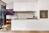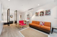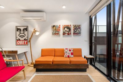 The stylish interior of this apartment features brilliant living and dining areas, stone bench top, SMEG cooking appliances, dishwasher, air-conditioner and building intercom system.